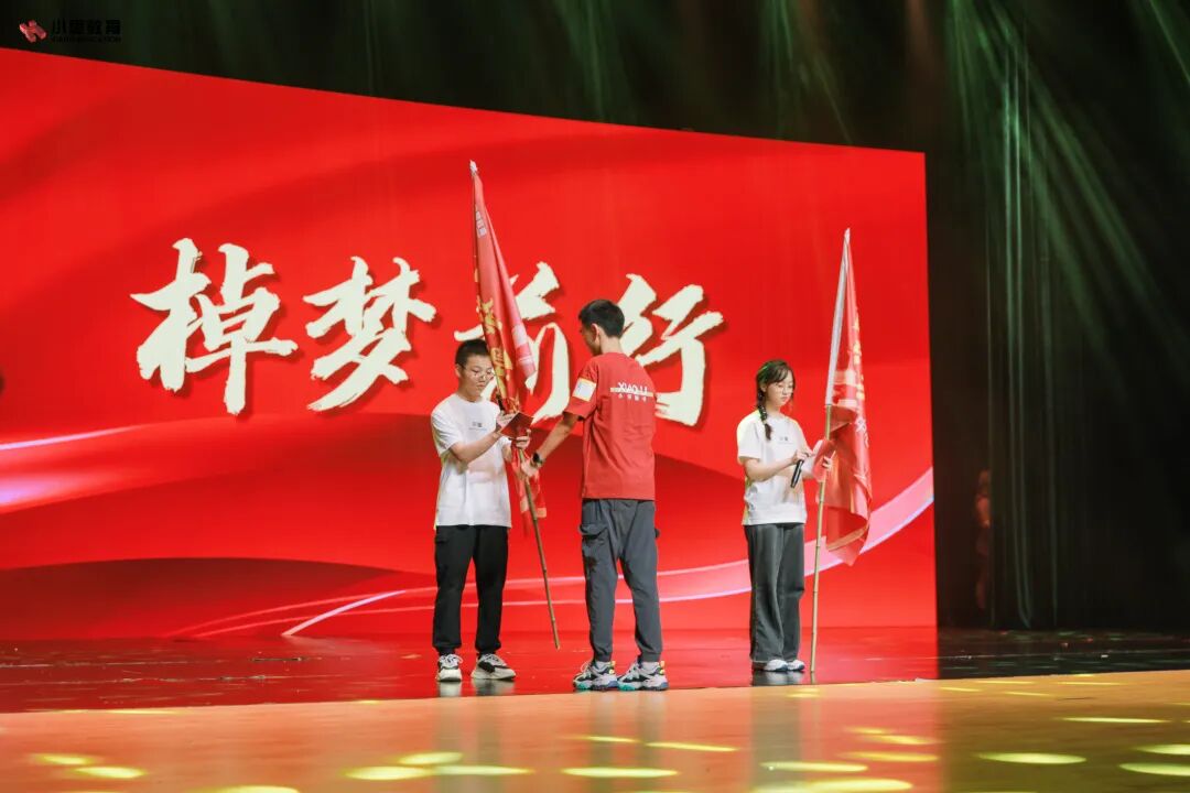在开学盛典上,2024届学长苏奇将代表小里精神的战旗交到武昌中心校区新生代表曹辰依和藏龙岛校区新生 代表谢亚斐手中。